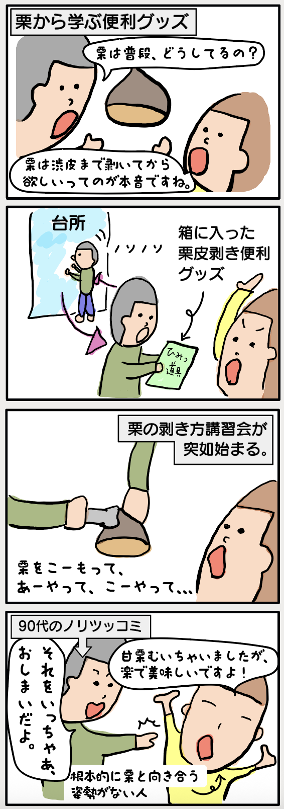 使い古されな道具は年季と哀愁漂う風貌。それを使って向いた栗はさぞ味に深みを増すのではないかという期待さえも抱く道具と、家族の語り、説明であった。